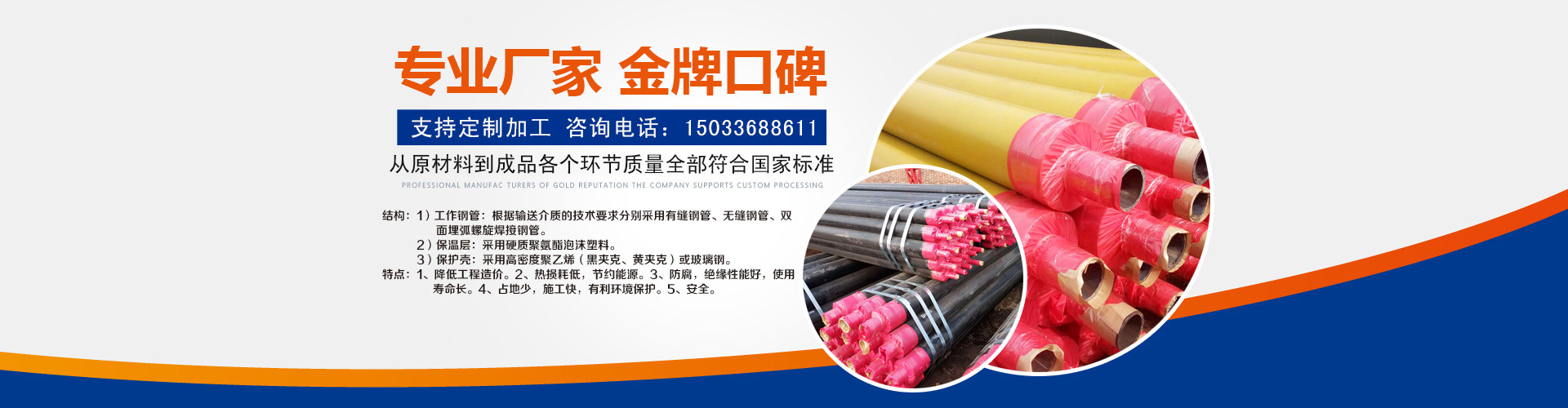 河北興松實業(yè)有限公司主營:預制直埋保溫管,鋼套鋼直埋保溫管,預制鋼套鋼保溫管,預制直埋熱水保溫管(件),預制直埋蒸汽保溫管(件),預制架空聚氨酯鍍鋅保溫管.公司自成立至今始終堅持技術(shù)領(lǐng)先、服務到位的產(chǎn)品宗旨,建立了一支由高素質(zhì)的專業(yè)技術(shù)人員和企業(yè)管理人員構(gòu)成的企業(yè)運營團隊。我公司從國內(nèi)外引進了大批先進的生產(chǎn)、檢驗設備,使企業(yè)的生產(chǎn)能力、生產(chǎn)規(guī)模、技術(shù)保障與質(zhì)量控制水平始終居于國內(nèi)同行業(yè)前列。
